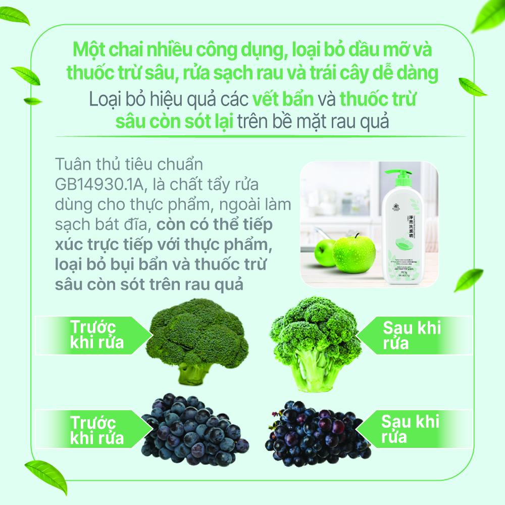 Với thành phần chính là xà phòng tự nhiên, khả năng làm sạch dầu độc đáo và siêu mạnh cho phép bạn dễ dàng làm sạch các món ăn nhiều dầu mỡ, loại bỏ hoàn toàn bụi bẩn còn sót lại. Ngoài ra sản phẩm còn loại bỏ được thuốc trừ sâu và hóa chất độc hại trên trái cây và rau quả, cho phép bạn yên tâm hơn khi ăn uống. Công thức siêu đậm đặc, có thể pha loãng và sử dụng. Giá cả phải chăng, tiết kiệm cho gia đình
