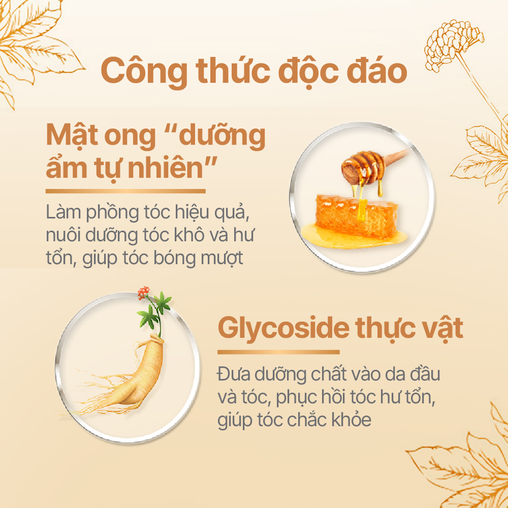 Thành phần thảo dược còn giúp bổ sung thêm lớp màng bảo vệ dưỡng ẩm cho bề mặt tóc, giúp tóc mềm mượt hơn sau khi sử dụng. Sản phẩm chứa các hoạt chất thực vật và chiết xuất nhân sâm cùng hoạt chất giao diện thế hệ mới, cung cấp đủ dưỡng chất cho tóc, giúp da đầu và tóc khỏe mạnh.